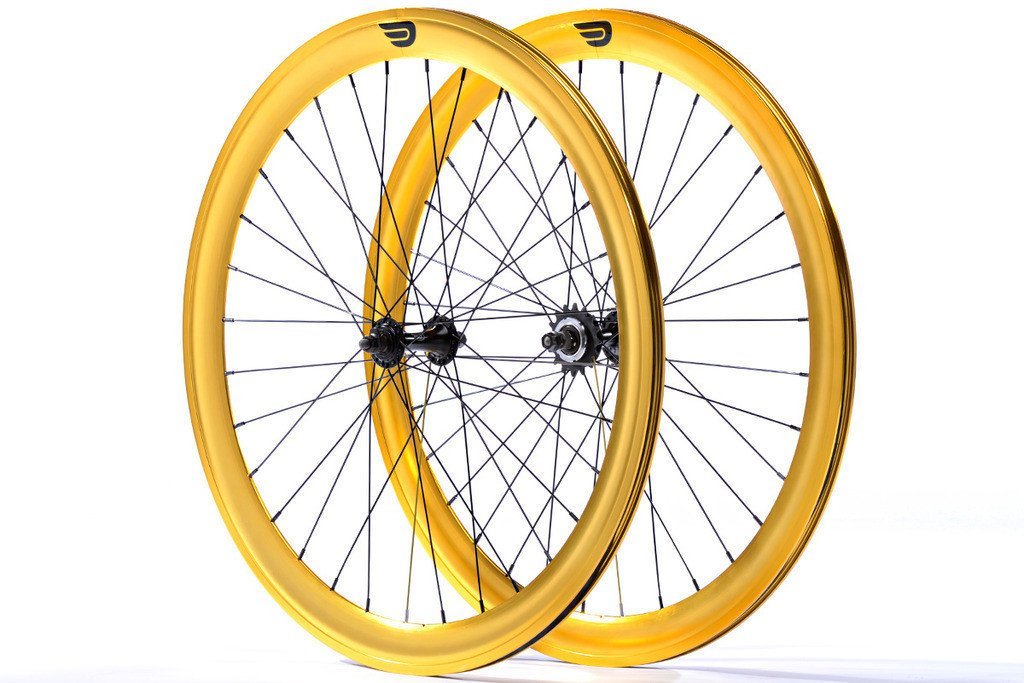 Pure Fix double-walled aluminum wheelsets are size 700C with a 50mm rim depth, front and rear. Our wheels include name-brand and laser-etched KT Quando hubs (100mm front, 120mm rear, 3/8" axle). Our rear wheels include flip-flop hubs with a pre-attached 16T fixed cog along with a 16T freewheel cog for single-speed riding. Our front and rear wheels are 32 spokes each. All wheelsets include nylon rim-strips to protect against sharp edges and prevent tube puncture.
