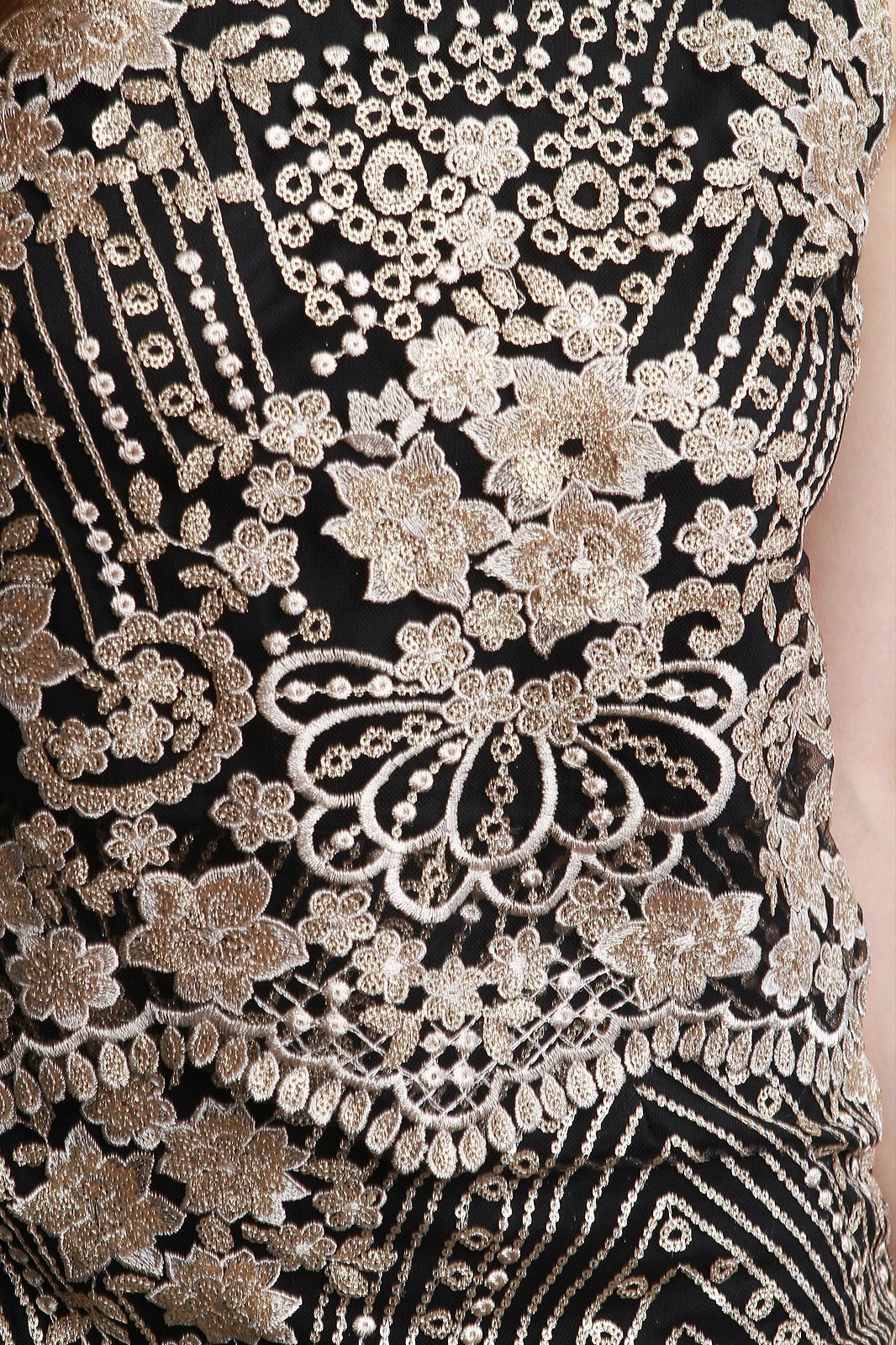 This two piece dress features metallic floral embroidery, crop top with a round neckline, sleeveless construction, back zipper closure, and matching high waisted midi skirt with back zip-up closure. Made in U.S.A. 60% Polyester, 40%Nylon. Lining: 100% Polyester.