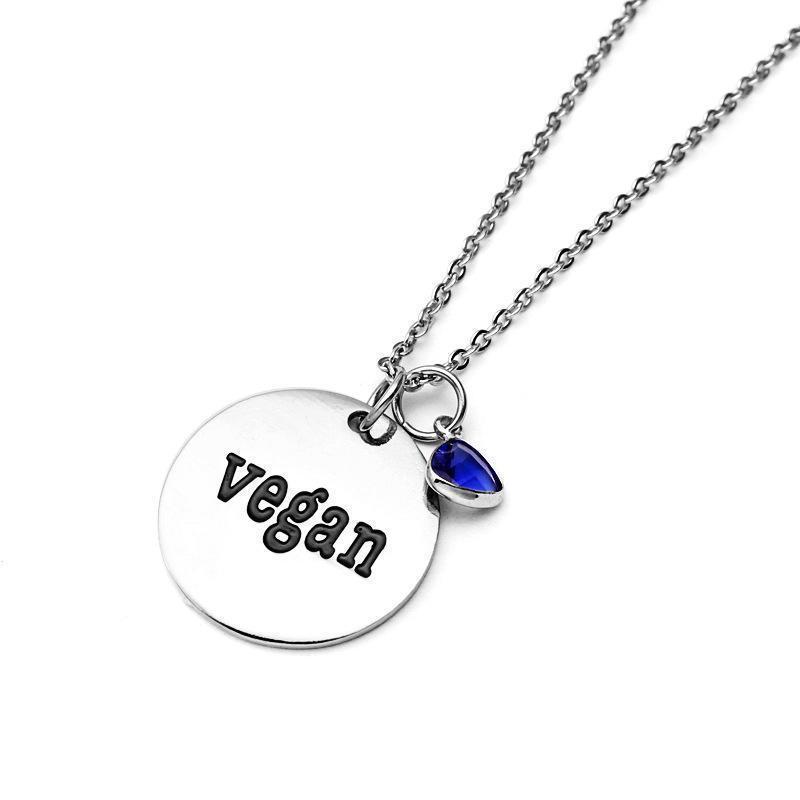 Make a statement and be proud to be a vegan with this beautiful stainless steel pendant necklace adorned with a colorful crystal charm. Necklace comes with choice of 3 color charms or plain without charm.